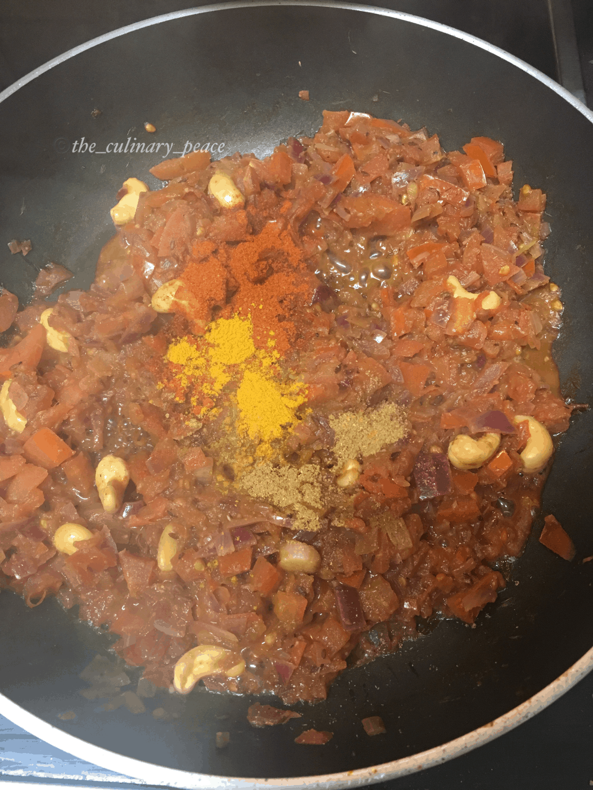 2. Now add tomato, cashews and cook until mushy. You can add few tablespoons of vegetable stock or water to quicken the process. Once it is done, put in turmeric powder, red chilli powder, cumin powder. Saute for 5-8 minutes.