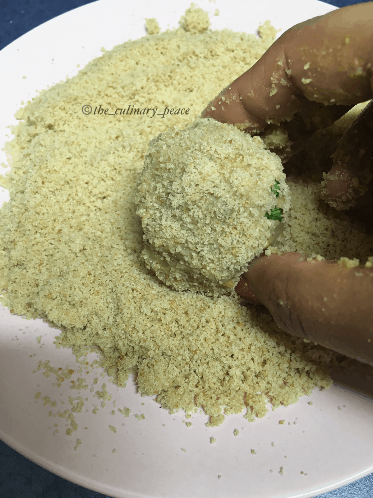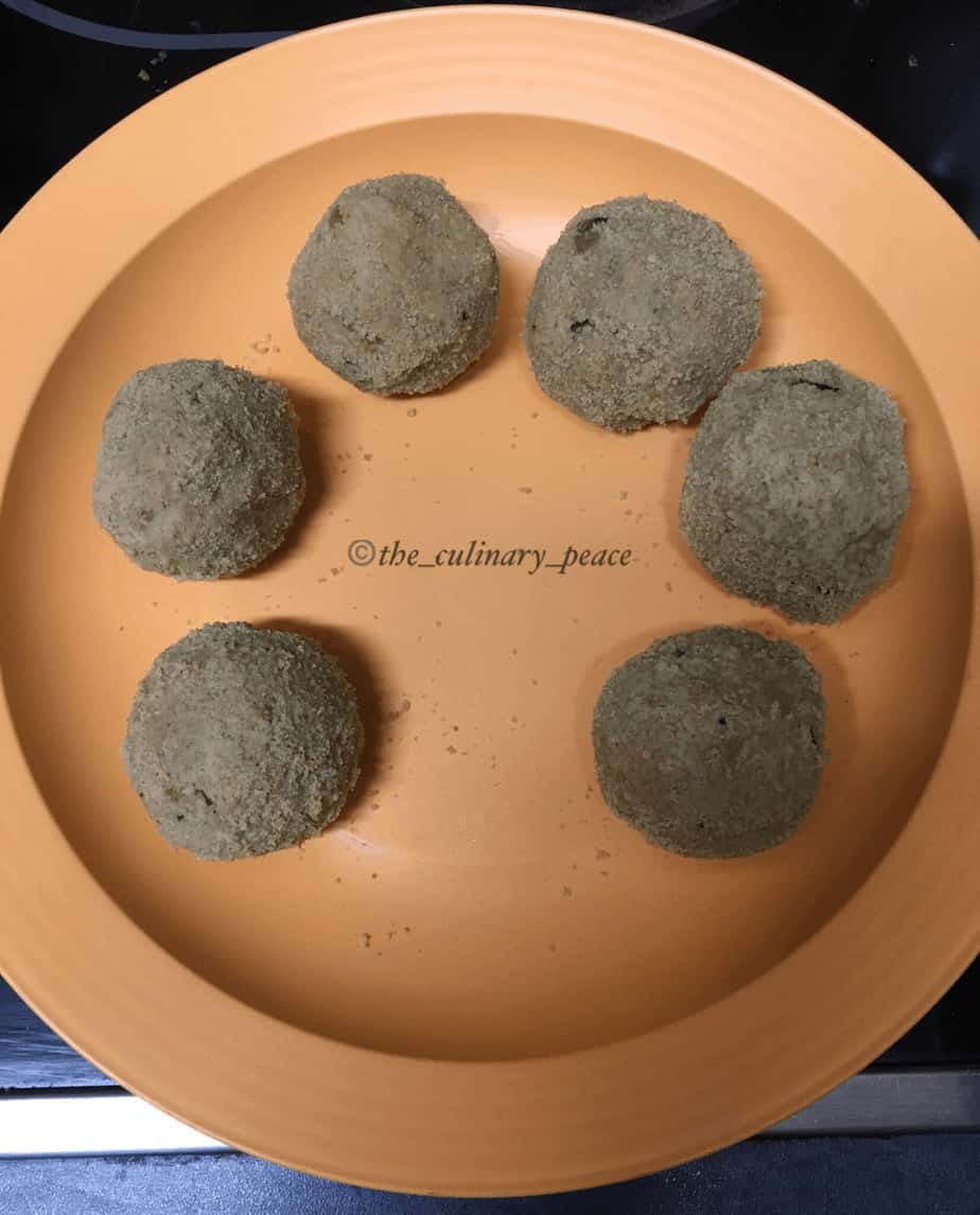 - Dip the kofta ball prepared earlier, in the corn flour mixture. Then, take it out and coat it uniformly with breadcrumbs. Repeat the same procedure for the remaining balls and transfer them onto a plate.