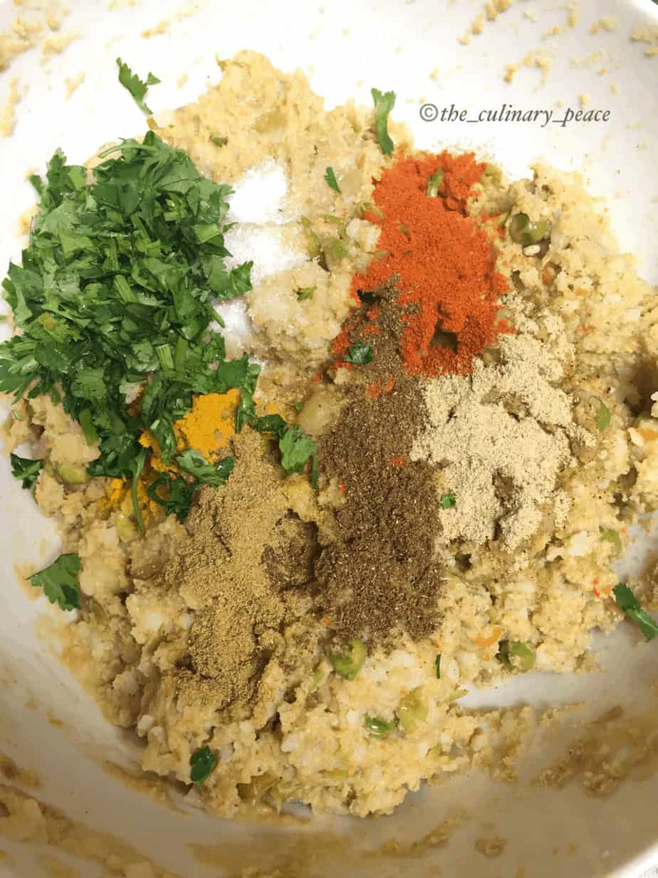 2. Add breadcrumbs, salt, cumin powder, red chilli powder, chaat masala. garam masala, coriander leaves and mix thoroughly. You should be able to make non-sticky balls. So, add more bread crumbs, if the mixture is sticky and you are not able to shape it to balls.
