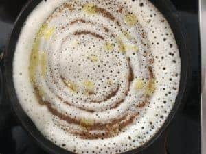 - Spread quickly in a circular motion to form concentric rings. Cover with a lid, add some ghee or oil and cook this for about 3-4 minutes until you see the dosa is browned on one side. Remember: If the batter if fermented well, you will see pores throughout the dosa.