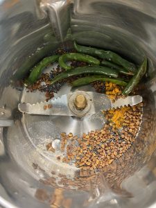 Also roast 6 green chilies (optional step). Add these to the mixer jar along with 1/2 tsp turmeric powder, and 1/4 tsp asafoetida.