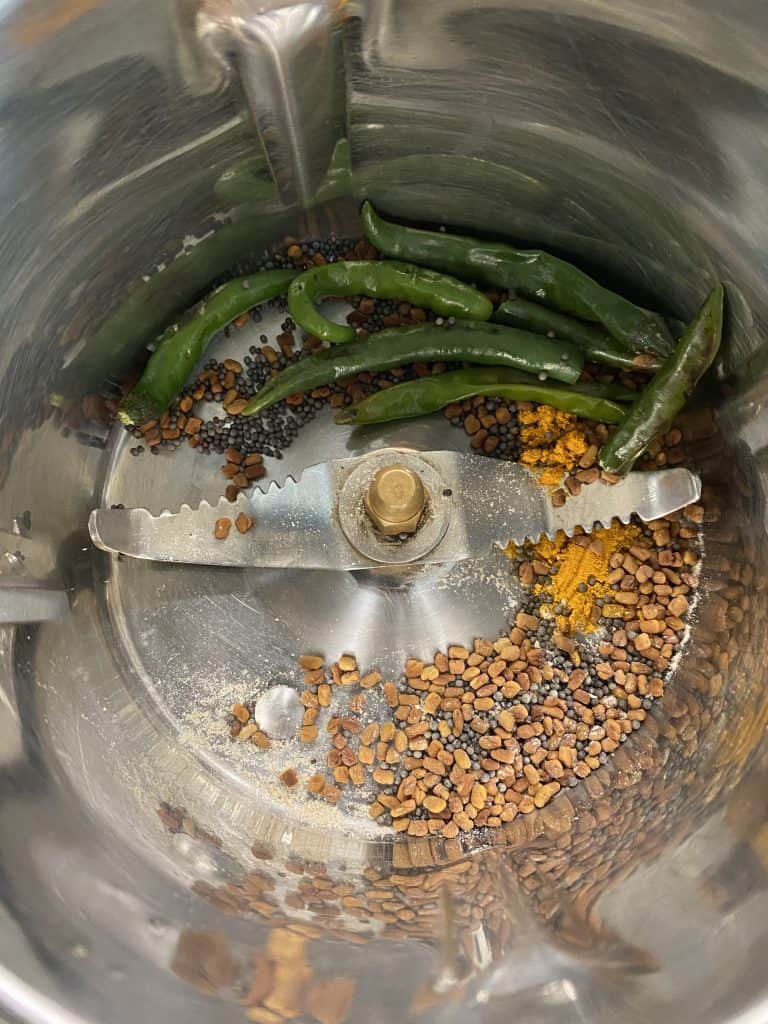 The chutney is made by dry roasting fenugreek seeds, mustard seeds and grinding them with raw mangoes, green chilies or dry red chilies, coconut, jaggery and salt.