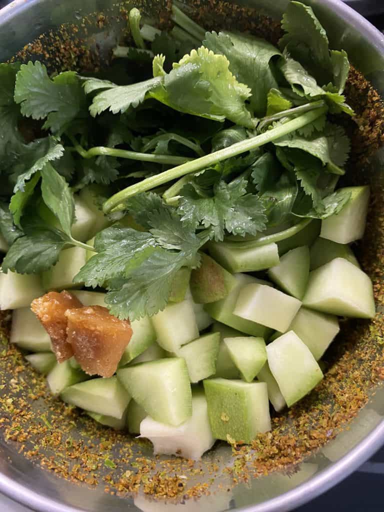• To this, add 2 cups chopped raw mangoes, jaggery piece (s), cilantro, 1/2 cup grated coconut, 1 tsp tamarind (if required).