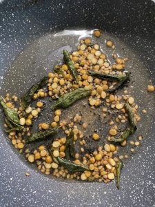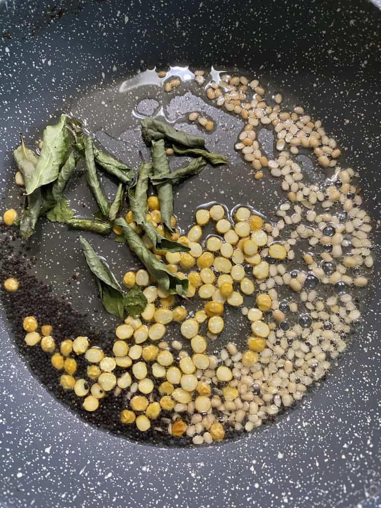 • In a pan, heat 2 tablespoons of oil, add in 1/2 tsp mustard seeds. Once they crackle, add in 1 tsp each chana dal, urad dal, 1 sprig of curry leaves, 1/4 tsp of asafoetida.