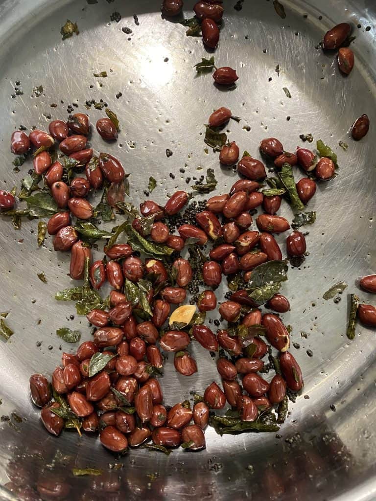 To do this, heat 1 tsp oil in a wide pan, crackle 1/2 tsp mustard seeds (if using), 1 sprig of curry leaves, and 2 to 3 tbsp peanuts.