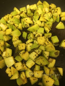 - Next add in the chopped raw mangoes, and about 1/2 cup water and let the mangoes get cooked well and turn soft. If required, add more water.